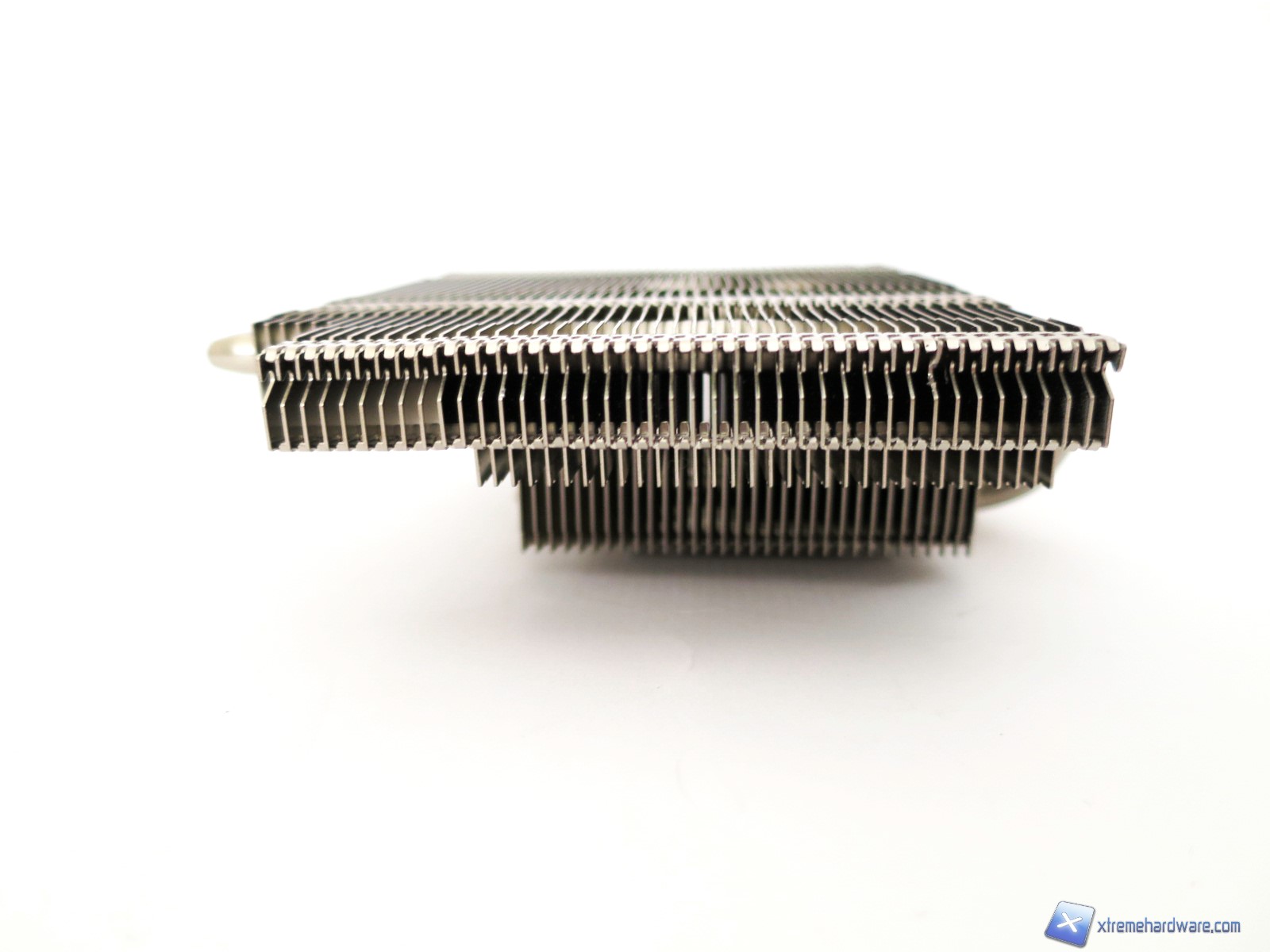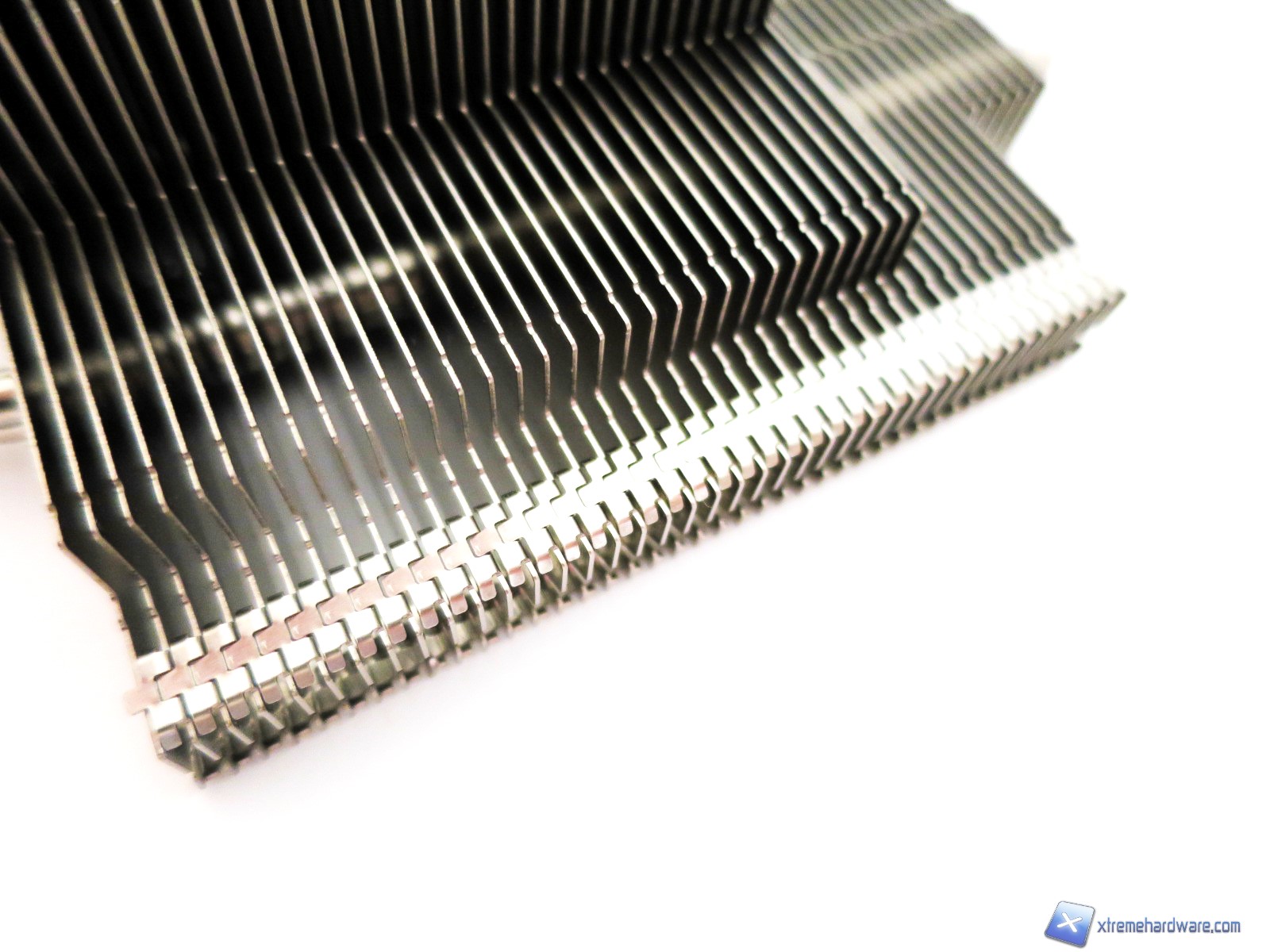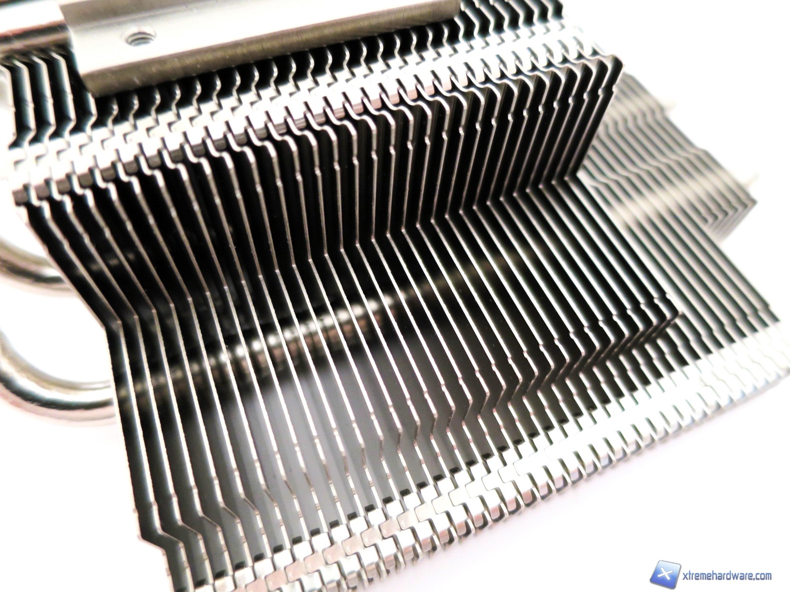 Andando ad analizzare il Gabriel nel dettaglio, ci troviamo di fronte un dissipatore ben rifinito e ben curato nei dettagli. Come abbiamo detto la struttura è un unico blocco di alluminio fuso al corpo lamellare. La base di contatto del DeepCool Gabriel è in rame, rivestita di una copertura in nickel che le conferisce un aspetto anche più elegante alla vista. Il DeepCool Gabriel è dotato di 4 heatpipe da 6 millimetri di diametro che partono dalla base di contatto per terminare nel corpo lamellare. Il corpo lamellare è composto da due blocchi, uno di ridotte dimensioni che è a contatto con la base, per migliorare lo scambio termico con la CPU. Lo spessore delle alette in alluminio è buono (circa 1 mm) così come la spaziatura che si attesta anch’essa a circa 1 millimetro. Sono inoltre presenti nel corpo lamellare superiore ben 47 alette in alluminio che diventano 41 non appena ci spostiamo verso l’esterno, dove le heatpipe non hanno più un contatto diretto con il corpo lamellare. Le alette non sono saldate alle heatipipe ma sono punzonate, tale tecnica permette di ridurre i costi di produzione, ma garantisce uno scambio termico leggermente inferiore rispetto alla saldatura.