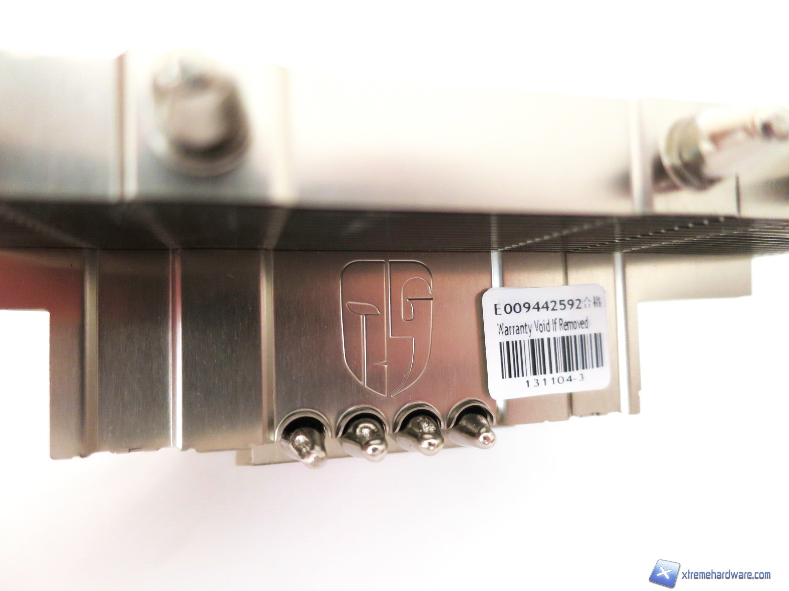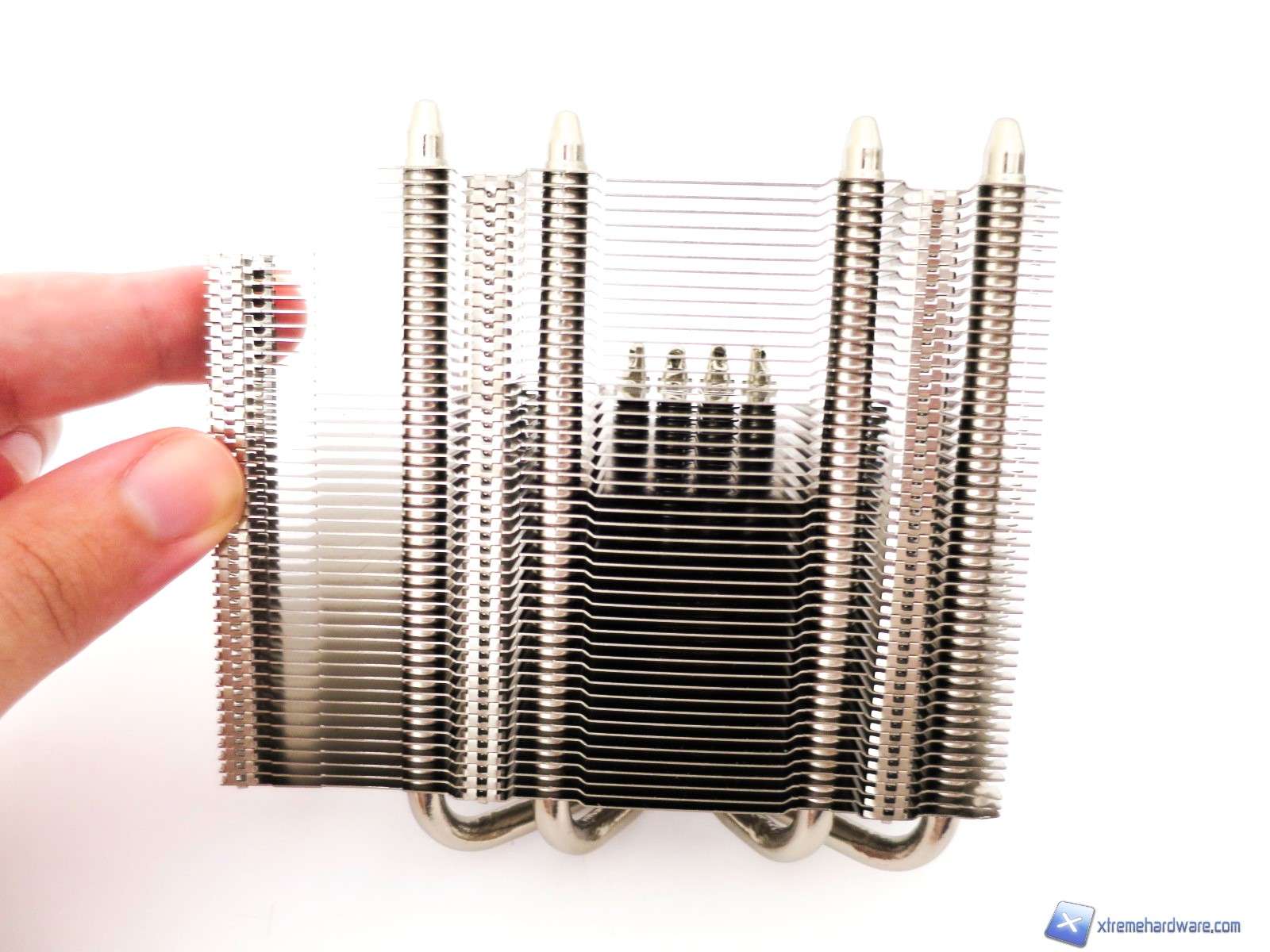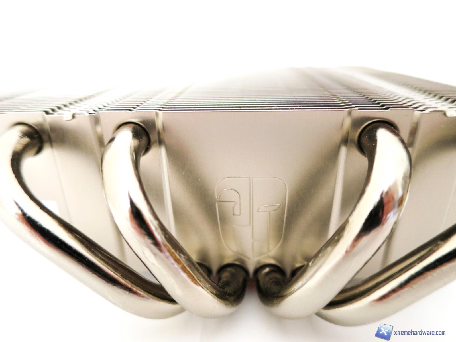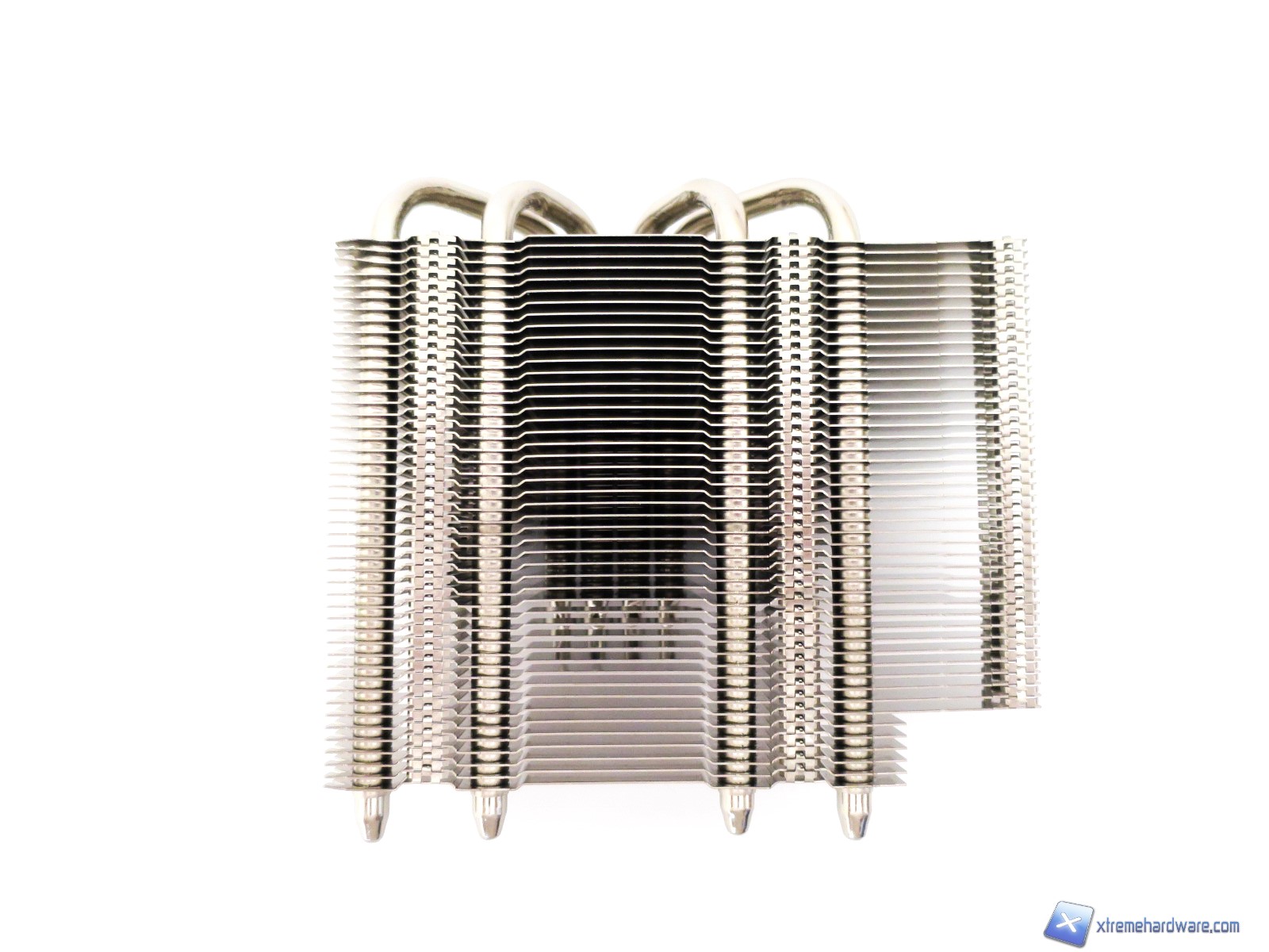 Andando ad analizzare il Gabriel nel dettaglio, ci troviamo di fronte un dissipatore ben rifinito e ben curato nei dettagli. Come abbiamo detto la struttura è un unico blocco di alluminio fuso al corpo lamellare. La base di contatto del DeepCool Gabriel è in rame, rivestita di una copertura in nickel che le conferisce un aspetto anche più elegante alla vista. Il DeepCool Gabriel è dotato di 4 heatpipe da 6 millimetri di diametro che partono dalla base di contatto per terminare nel corpo lamellare. Il corpo lamellare è composto da due blocchi, uno di ridotte dimensioni che è a contatto con la base, per migliorare lo scambio termico con la CPU. Lo spessore delle alette in alluminio è buono (circa 1 mm) così come la spaziatura che si attesta anch’essa a circa 1 millimetro. Sono inoltre presenti nel corpo lamellare superiore ben 47 alette in alluminio che diventano 41 non appena ci spostiamo verso l’esterno, dove le heatpipe non hanno più un contatto diretto con il corpo lamellare. Le alette non sono saldate alle heatipipe ma sono punzonate, tale tecnica permette di ridurre i costi di produzione, ma garantisce uno scambio termico leggermente inferiore rispetto alla saldatura.