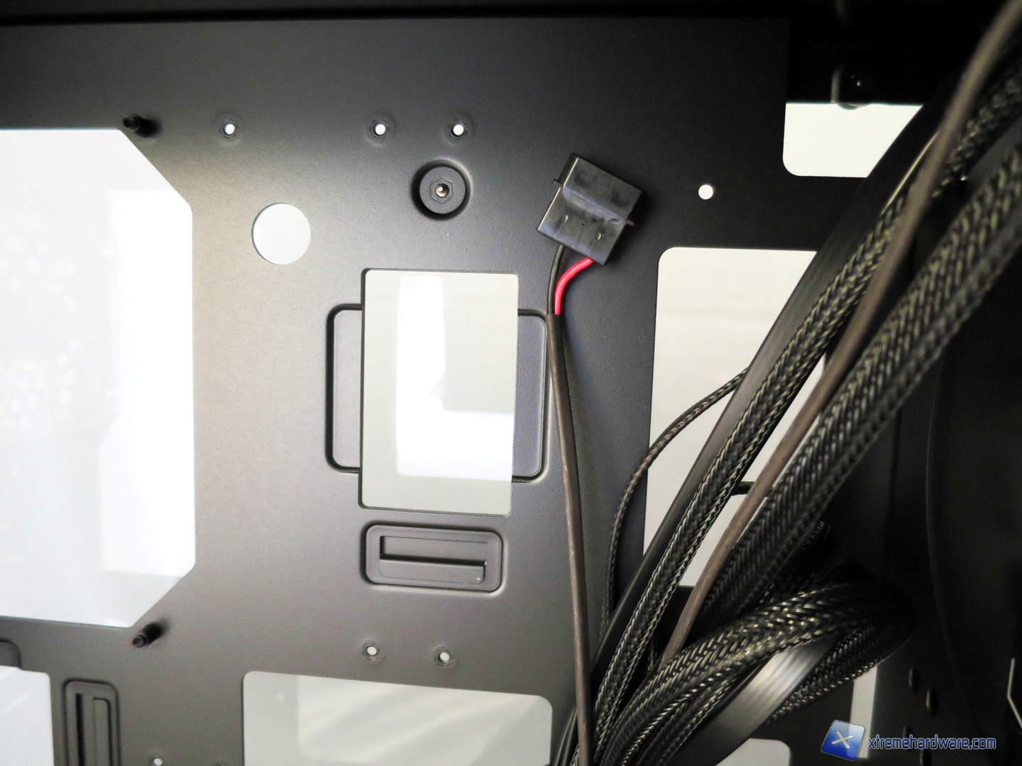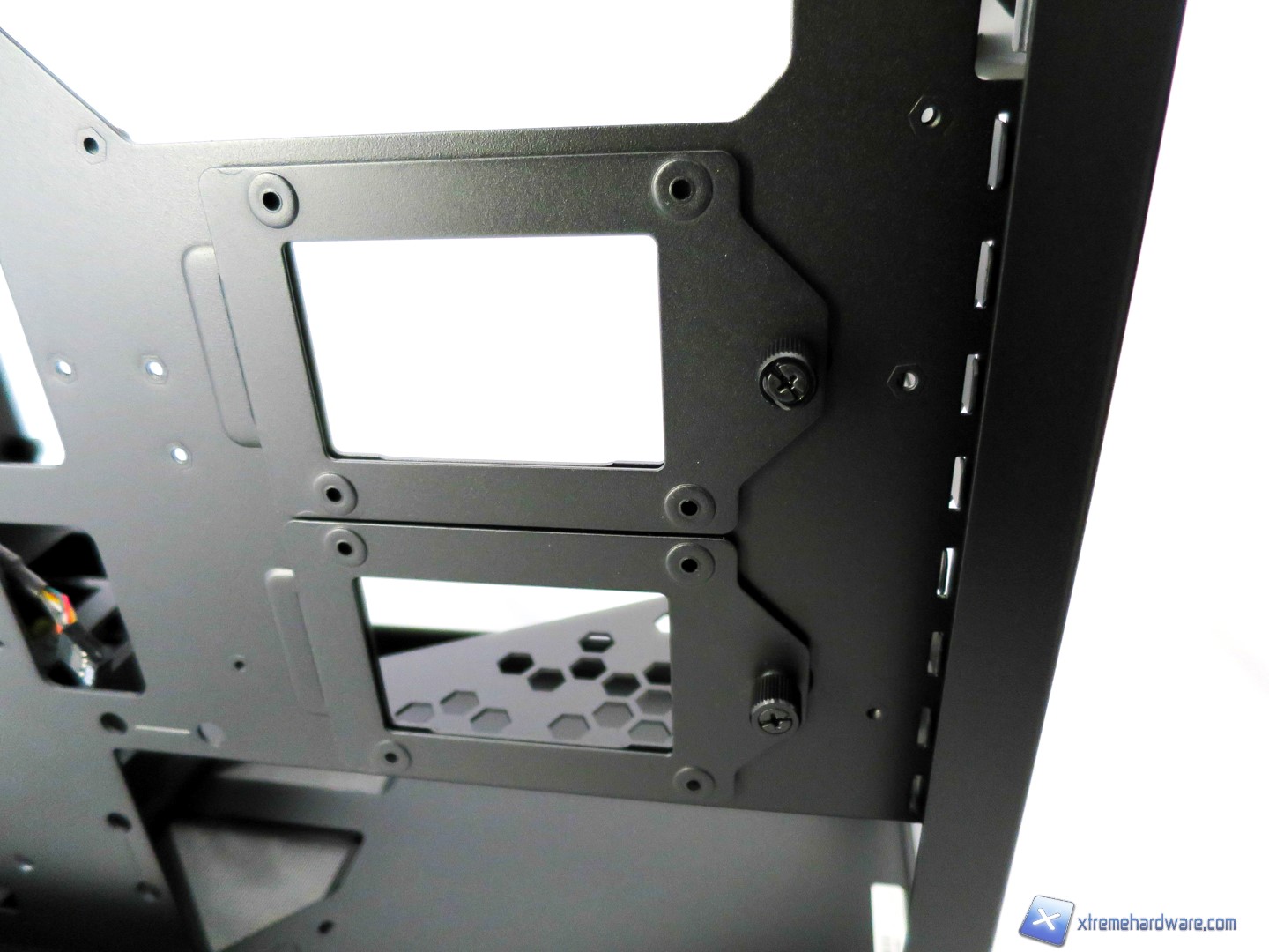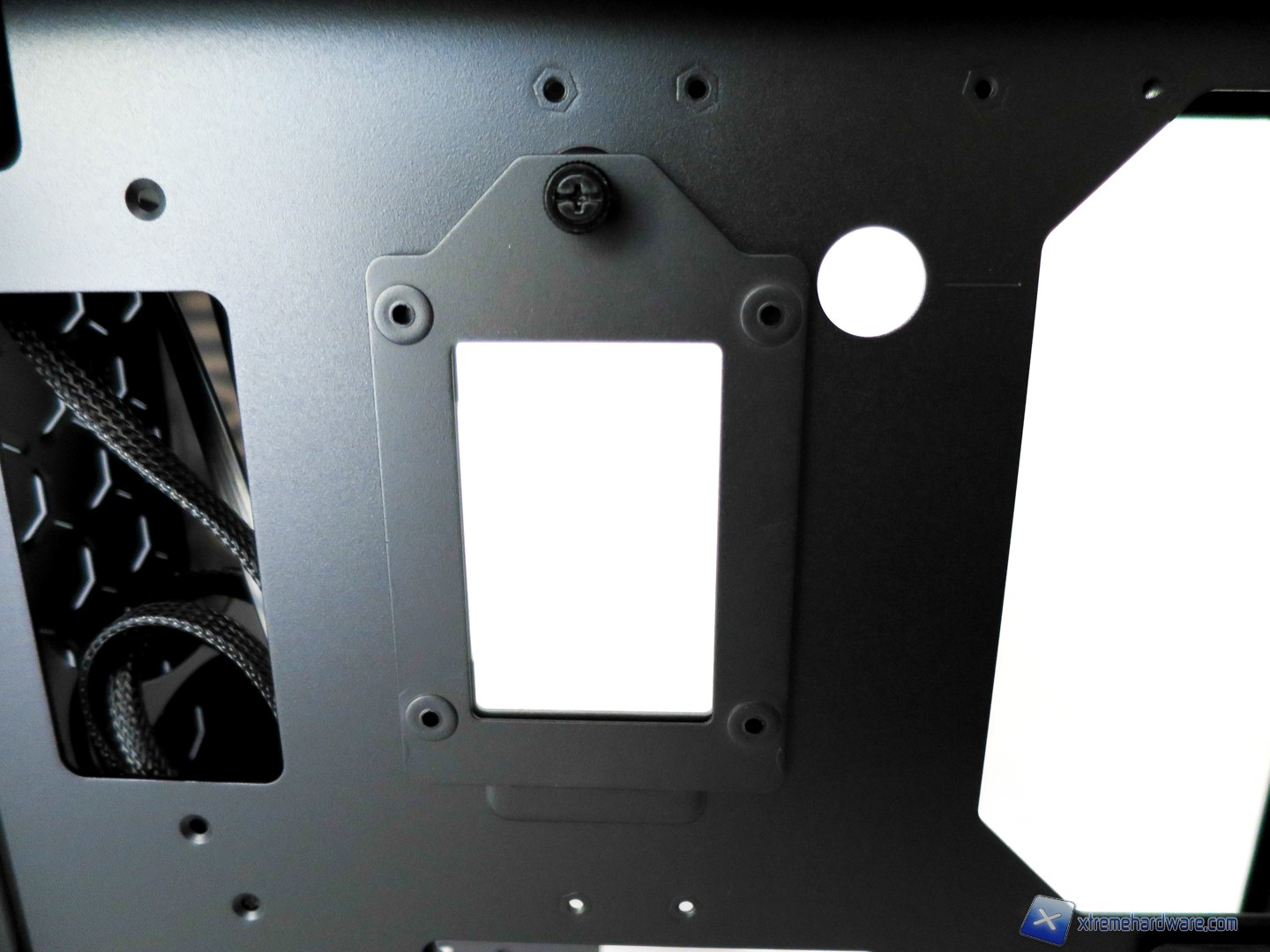 Osservando meglio l’interno del case, possiamo vedere come il tray della scheda madre e più precisamente il supporto in acciaio sia caratterizzato da diversi fori per effettuare un cable management dei cavi provenienti dall’alimentatore e dal frontale e per ospitare nella zona posteriore i tre supporti per SSD. Possiamo osservare anche come il foro per installare un eventuale backplate sia di buone dimensioni e ci permetterà di installare o rimuovere eventuali dissipatori senza smontare la scheda madre dall’interno del case.