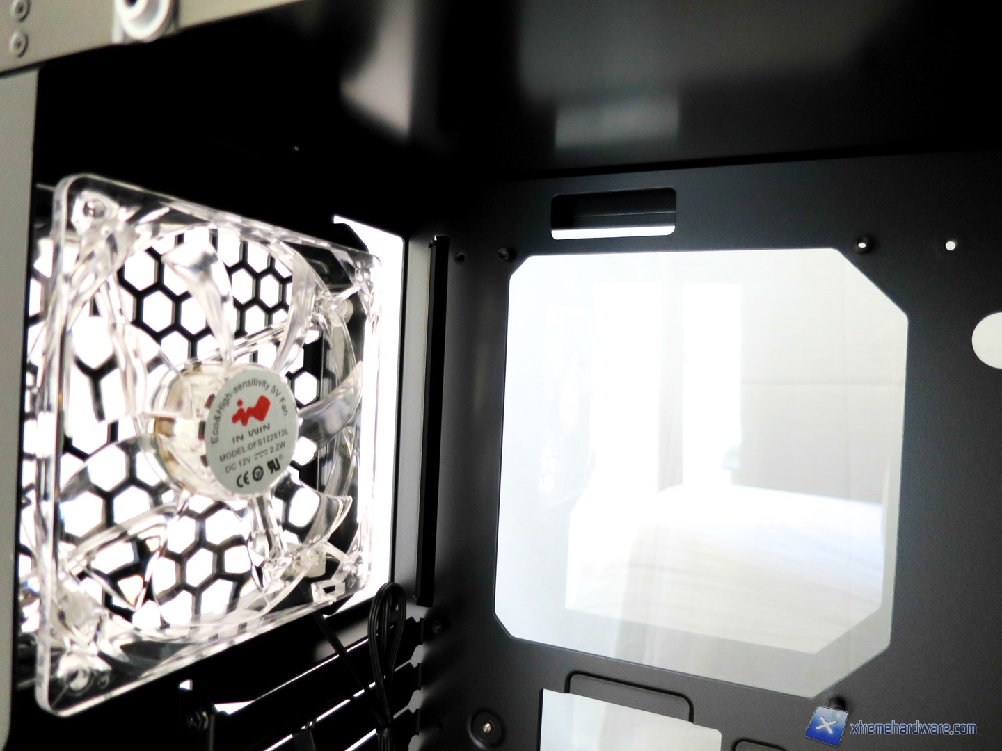 Scendendo, troviamo la ventola da 120mm preinstallata modello DFS122512L trasparente e con LED bianchi per rendere l’effetto ed il look di sera dell’In WIn 805 ancora più accattivante.