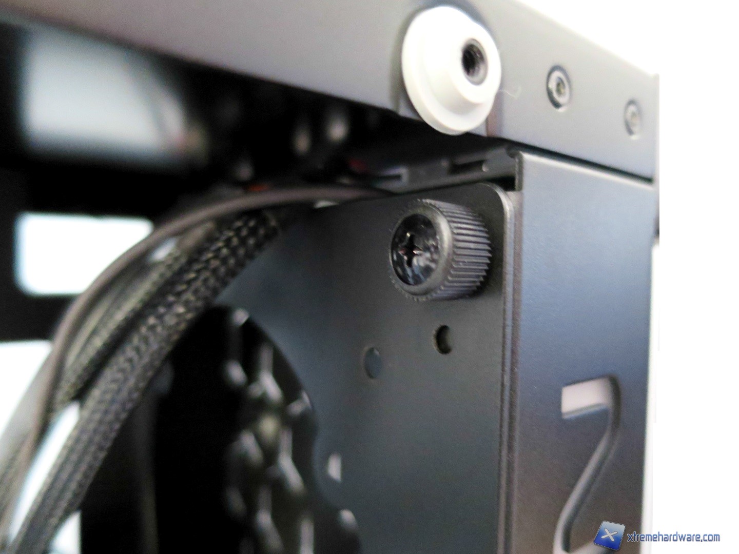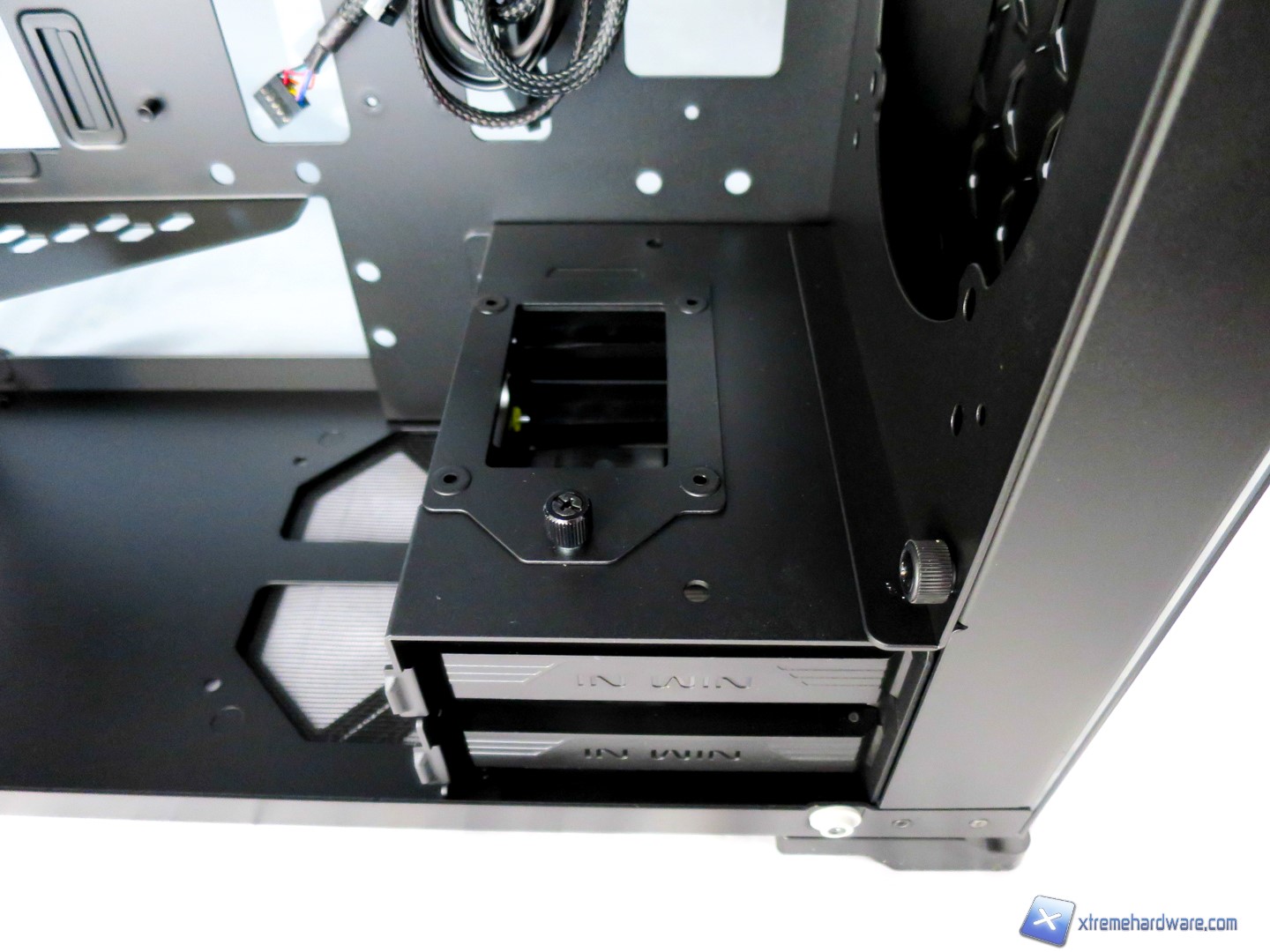 Infine, spostandoci nella paratia laterale destra interna, possiamo osservare come questa sia caratterizzata da un supporto in metallo per ospitare la seguente configurazione ventole 2x120mm o 2x140mm in aggiunta al cage degli Hard Disk da poter montare in verticale zona interno case. Così facendo potremo avere un’ampia modularità a seconda della configurazione da installare nell’In Win 805. Ricordiamo che il supporto in metallo potrà essere rimosso nel caso non ne abbiate necessità grazie a due viti Tool-less.