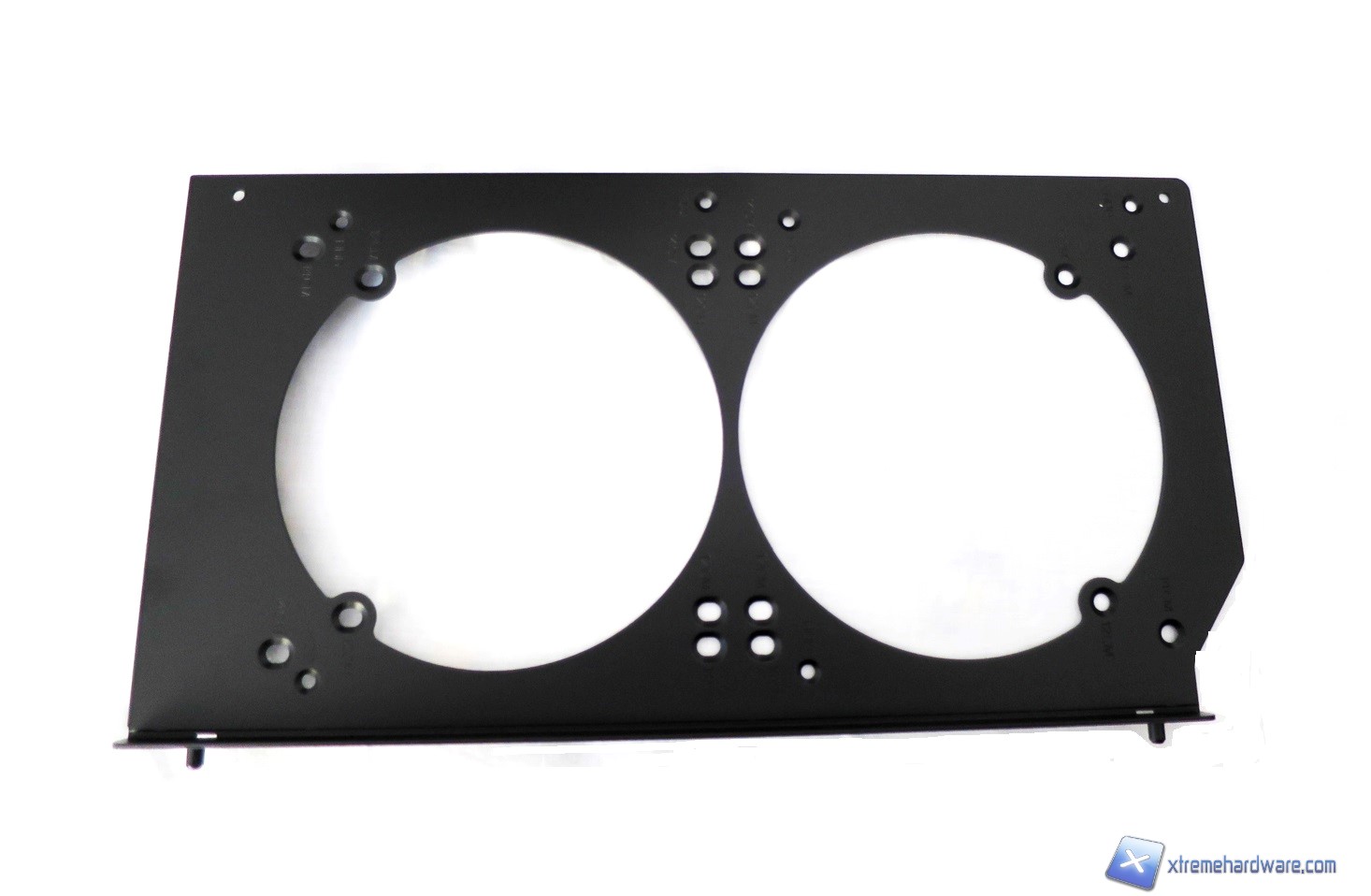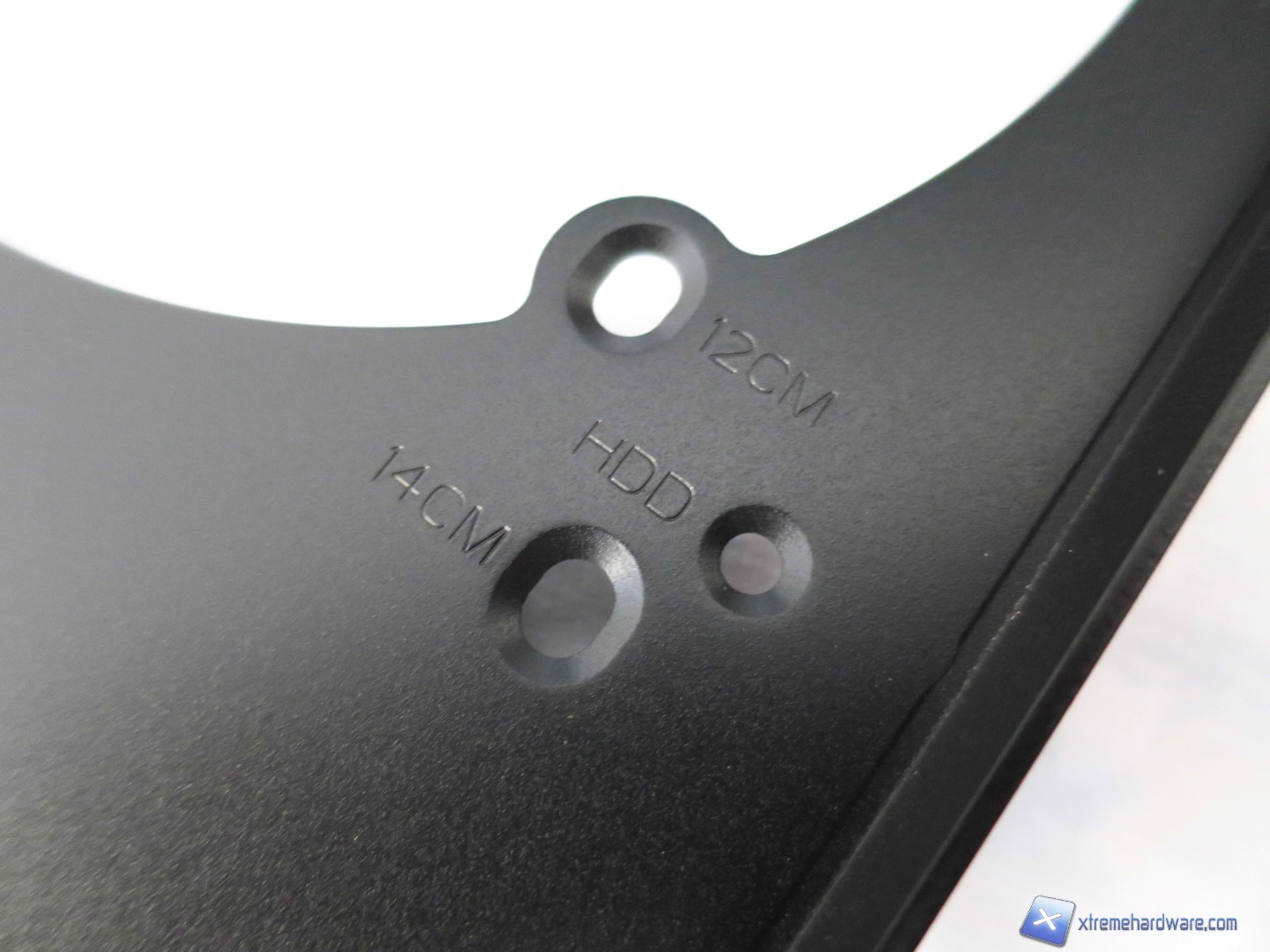 Dettaglio del supporto in metallo e dei fori contrassegnati per ventole da 120mm e 140mm oltre che per il cage.