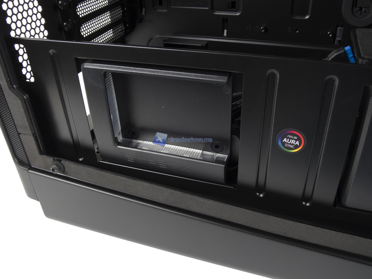 Nella parte inferiore è difficile non notare il supporto orizzontale in metallo con il sistema di illuminazione BitFenix SSD Chroma e i due alloggiamenti per SSD. Sistema che abbiamo visto già con il BitFenix Aurora (QUI la recensione).