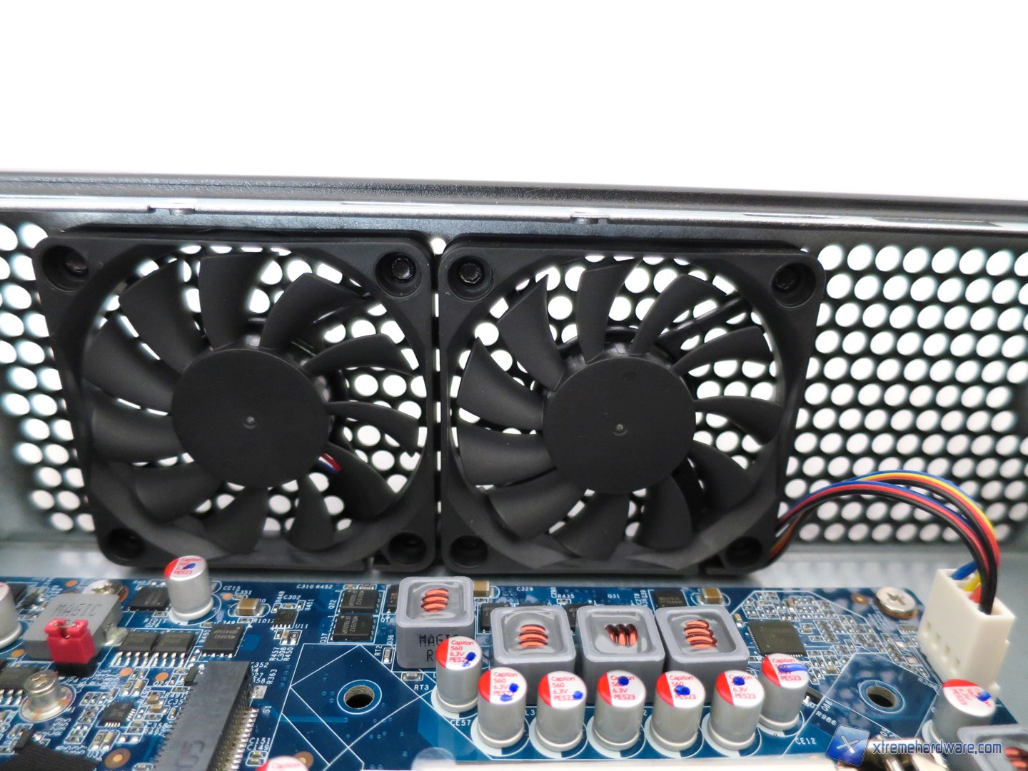 Da notare come la forma del dissipatore sia sagomata appositamente per arrivare in corrispondenza delle due ventoline da 60mm poste nella paratia laterale del Mini-PC e collegate entrambe alla scheda madre tramite un connettore a 4 Pin. Queste ventole da 60mm sono poste in estrazione e non in immissione, rendendo agevole la fase di trasferimento termico del calore da dentro il Mini-PC. In base alla dotazione HW e temperature si potrebbe provvedere anche al cambio del senso di rotazione delle ventole.