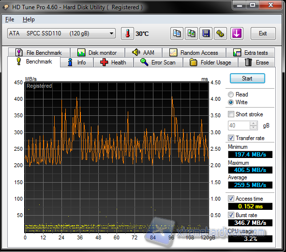 HD Tune è un'utility per Hard disks e SSDs con molte funzioni. Può essere utilizzato per misurare in modo accurato le performance del drive, per trovare errori, per controllare lo stato vitale del drive, per cancellare dati in modo sicuro e molto altro ancora. La versione da noi utilizzata è l'ultima disponibile al momento e si tratta della 4.60. Il programma è disponibile in due versioni, una freeware (HD Tune) e una a pagamento (HD Tune PRO). Nel nostro caso è stato necessario utilizzare la versione PRO in quanto è l'unica a misurare le prestazioni del drive in scrittura.