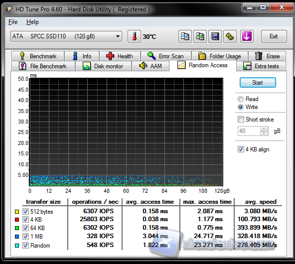 I test hanno evidenziato davvero delle buone prestazioni con il controller SF-2281 specialmente in lettura. In lettura abbiamo una media di 499 MB/s in sequenziale con un access time di 0.098 ms. In scrittura invece le prestazioni sono un po' sottotono con una media di 259 MB/s con tempi di access time di 0.152 ms. Altrettanto buoni sono i livelli degli IOPS sui 4K; in scrittura abbiamo ben 25803 IOPS.